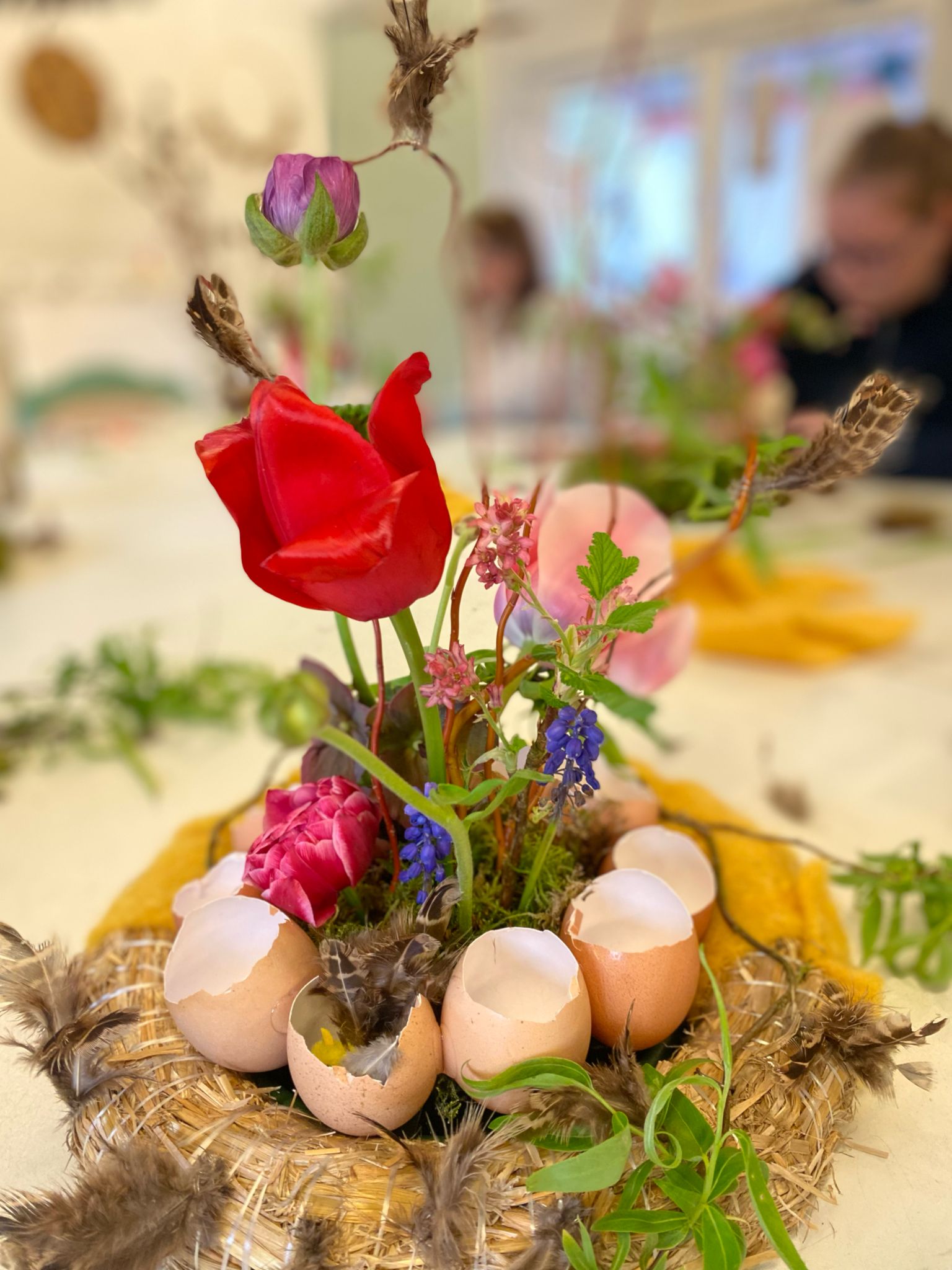 Het bloemschikken zelf was meer dan een workshop – het was een moment van samenzijn. Terwijl de geur van verse bloemen zich mengde met het aroma van koffie en thee, groeide het onderlinge contact vanzelf. Tussen het rangschikken van paastakken, voorjaarsbloemen en groen uit ‘un bietje groenmoestuin’ van FlowerWise ontstonden gesprekken, gedeelde lachjes en zelfs nieuwe plannen voor toekomstige activiteiten.