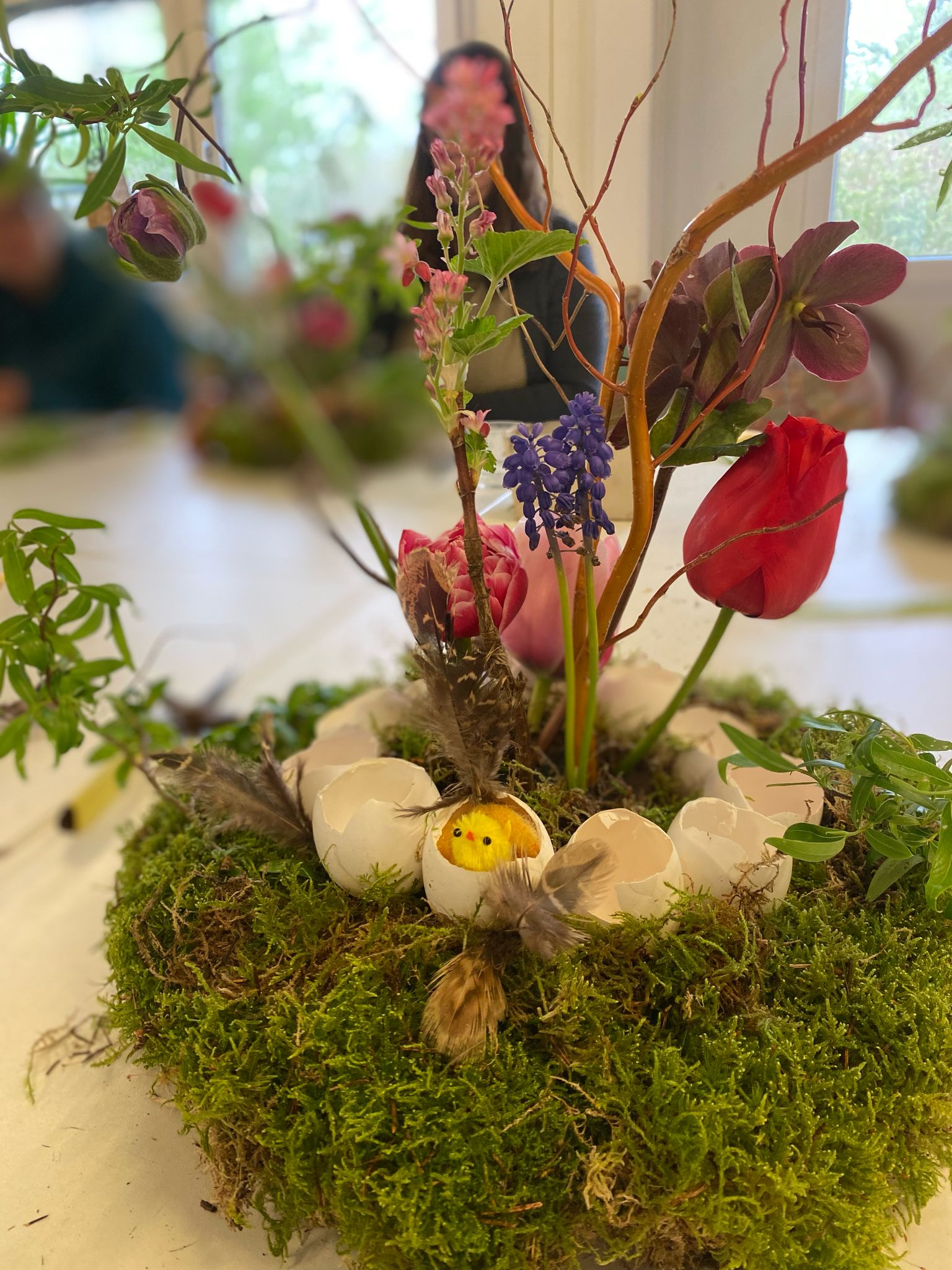 Onder de deskundige begeleiding van Fennie Bierings, kwamen deelnemers – vooral vrouwen – samen om in een huiselijke sfeer hun eigen paasstuk te maken. De locatie, midden in de stad maar met een gezellige, natuurlijke uitstraling, bood precies de juiste setting voor deze rustige en verbindende ochtend. We zijn FlowerWise ontzettend dankbaar voor het openstellen van hun locatie en het delen van hun vakmanschap.