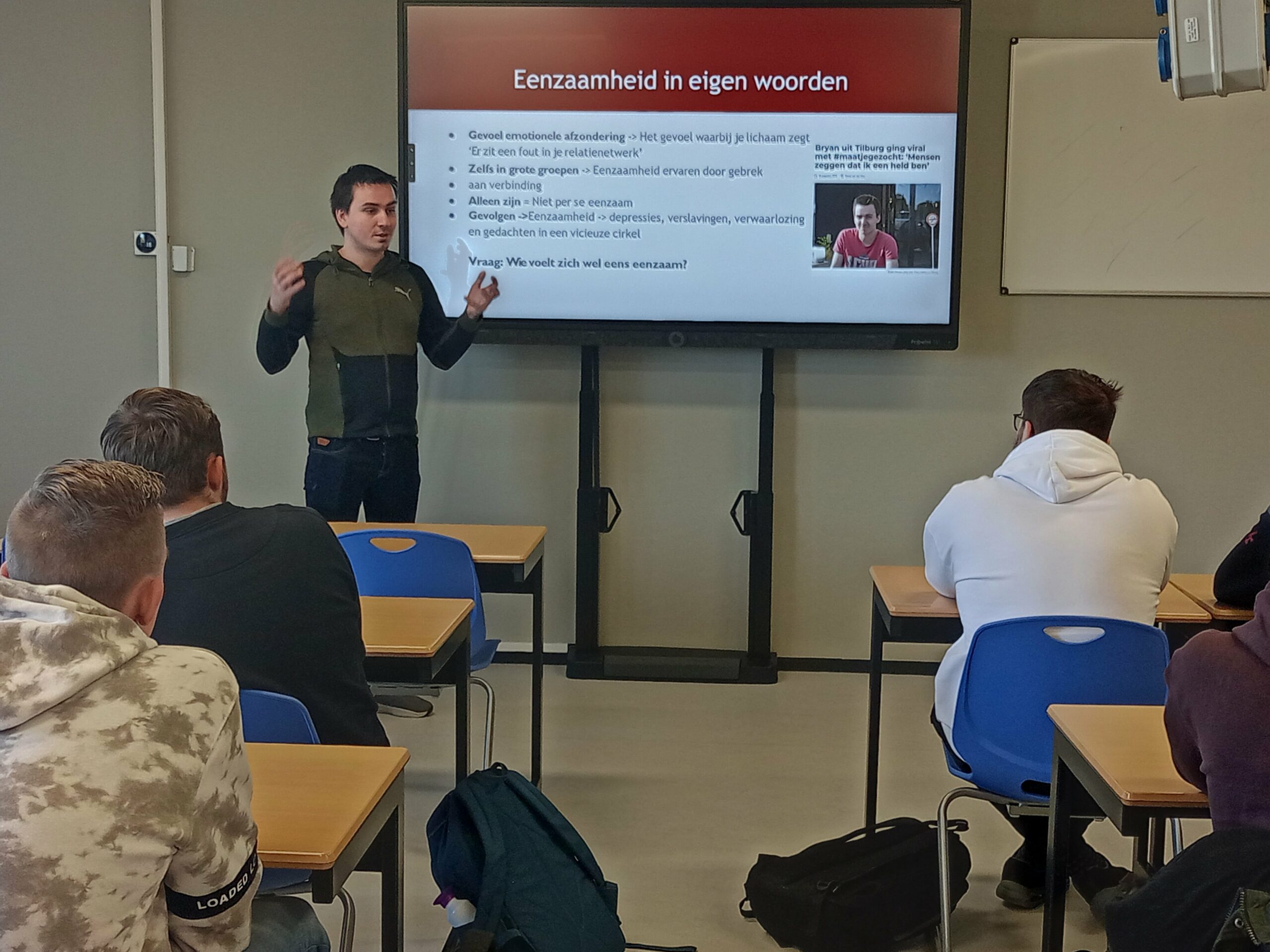Tijdens het gastcollege heeft Bryan de studenten uitgelegd wat eenzaamheid precies inhoudt en wat de mogelijke gevolgen ervan kunnen zijn. Hij heeft dit college in totaal aan vier verschillende klassen gegeven, waarbij de studenten aandachtig naar zijn verhaal hebben geluisterd.